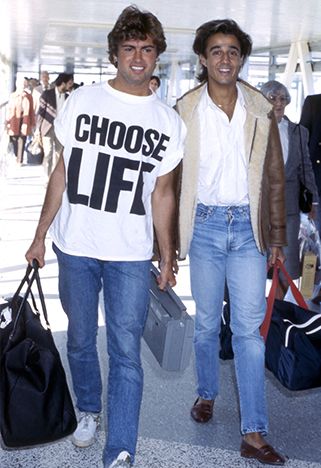 1984: Wham!’s “CHOOSE LIFE” tee – Worn in the “Wake Me Up Before You Go-Go” video. Bright, bold, anti-drug, anti-war and instantly iconic.